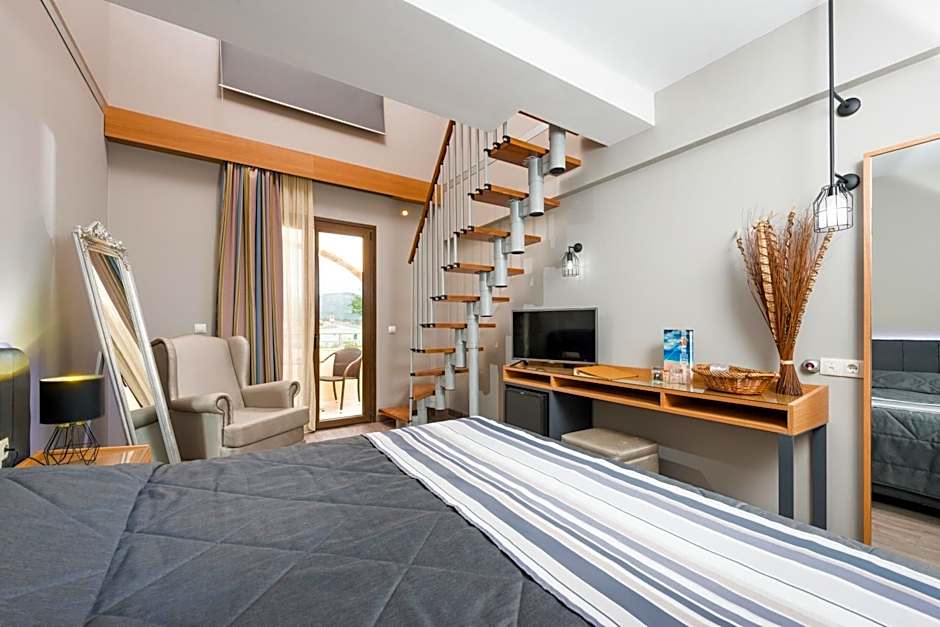 Offering sea views, this superior maisonette features an en-suite, king-size bedroom with an internal stairway leading to a separate bedroom with attached bathroom with 2 single beds. It features: -air conditioning -flat-screen satellite TV -mini-bar -safe -hairdryer -free WiFi.
